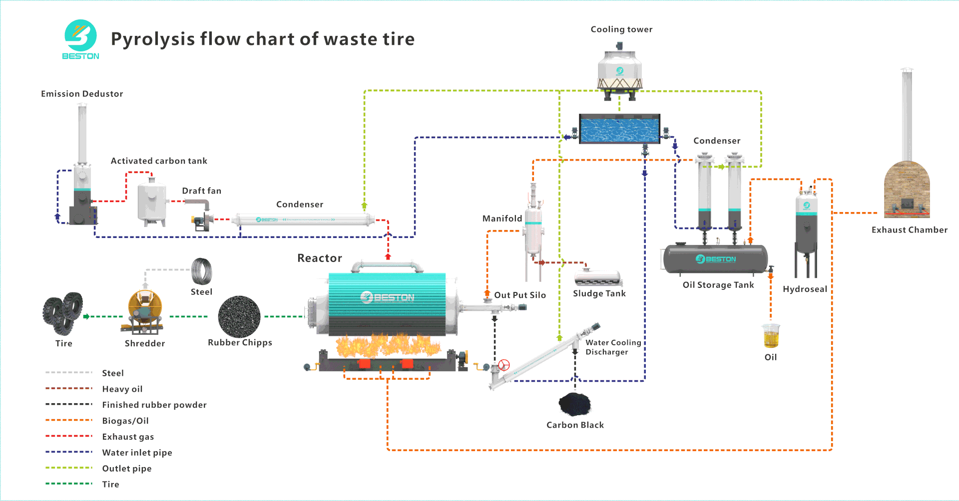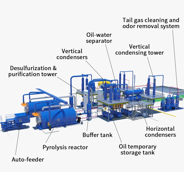 Örnek olarak odun atıkları, Shredder den 3-5 mm olarak kıyılır. Sonra, proliz sistemi 400 'C ye kadar ısıtılınca sisteme atık beslemesi yapılır. Sistem de kalış süresi 15-30 dakika olursa, %30 katı (biochar), %30 sıvı (bio oil), %30 yoğunlaşmayan gaz oluşur. Sistem de kalış süresi 10-20